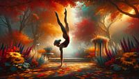 Op de foto presenteert een balletdanseres zich in een omgekeerde pose, perfect in balans op een enkel punt, haar benen zwierig de lucht in. Ze bevindt zich in een herfstpark waar de bomen gloeien in een warm spectrum van rood, oranje en geel, een visuele echo van de vallende bladeren op de grond. Het kleurenpalet is diep en uitnodigend…