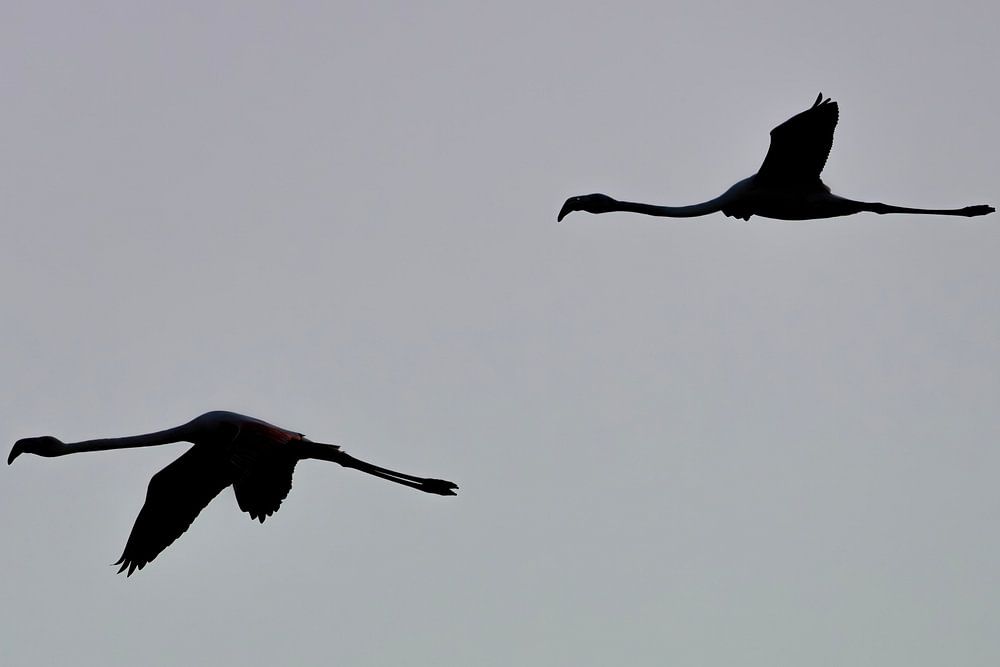 Twee flamingo’s in vlucht, weergegeven als elegante silhouetten tegen een zacht getinte, koele lucht. De subtiele overgang van kleur in de achtergrond benadrukt de sierlijke vormen van de vogels en creëert een gevoel van rust en eindeloze ruimte. De eenvoud en gratie van deze compositie maken het tot een tijdloos kunstwerk dat perfect past in een moderne, minimalistische inrichting.