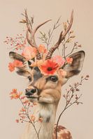 "Elegantie in Bloei" is een betoverend kunstwerk dat de gracieuze schoonheid van een hert combineert met de delicate pracht van bloemen. Het hert, met zijn sierlijke gewei versierd met zachte roze en oranje bloemen, straalt een serene en bijna sprookjesachtige charme uit. De fijne details van zowel het gewei als de bloemen worden versterkt door de rustige, pastelkleurige achtergrond, waardoor een harmonieus en elegant beeld ontstaat. Dit kunstwerk is perfect voor natuurliefhebbers en voegt een vleugje magie en verfijning toe aan elk modern interieur.