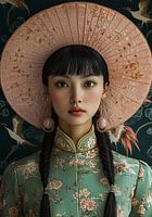 "Elegantie in Bloei" toont een Aziatische vrouw die gratie en verfijning uitstraalt. Ze draagt een prachtige turquoise jurk versierd met delicate roze bloemen, die zorgen voor een levendig en toch harmonieus kleurenpalet. Haar grote roze hoed, rijkelijk gedetailleerd als een ontluikende bloem, vormt een opvallend contrast tegen de donkerblauwe achtergrond. Roze oorbellen accentueren haar gelaatstrekken en completeren haar elegante verschijning. Op de achtergrond zweven beige en bruine kraanvogels, die symbool staan voor geluk en sereniteit, en het tafereel een vleugje mystiek en natuurlijke schoonheid geven. De combinatie van levendige kleuren, elegante patronen en serene symboliek vangt het gevoel van verfijnde schoonheid die zowel sterk als subtiel is, alsof ze een levende belichaming van de natuur en kunst is.