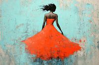 Elegantie in Contrast - Dit vrouwen schilderij toont een elegant silhouet van een vrouw in een opvallende, oranje jurk tegen een rustgevend turquoise achtergrond, waarbij de eenvoud en de contrasterende kleuren een serene uitstraling geven.