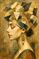 Dit kunstwerk mengt klassieke portretschilderkunst met moderne abstractie. Het serene vrouwelijke profiel straalt rust uit en wordt verlicht door warm licht. De geometrische hoofdtooi in aardse en blauwgrijze tinten contrasteert met haar zachte gelaat. Een oorbel voegt gratie toe en de textuur geeft diepte. Het schilderij is een…