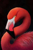 Een intrigerend portret van een flamingo, meesterlijk weergegeven in een combinatie van intense rode en roze tinten tegen een diep contrasterende zwarte achtergrond. De verfijnde details van de verenstructuur en de subtiele kromming van de hals benadrukken de sierlijke vormen van deze vogel. Het gele oog, scherp omlijnd, voegt een intense expressie toe aan het beeld. Deze compositie, zowel modern als tijdloos, is ideaal voor liefhebbers van natuurkunst en unieke wanddecoraties die een vleugje exotische charme en verfijning aan elke ruimte toevoegen.