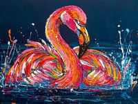 De krachtige penseelstreken en de harmonieuze combinatie van roze, oranje en paarse tinten zorgen ervoor dat de flamingo bijna uit het doek lijkt te komen. De donkerblauwe achtergrond creëert een prachtig contrast, waardoor de felgekleurde veren van de flamingo nog meer tot hun recht komen. De dynamische spatten van verf geven het werk een extra gevoel van beweging en levendigheid.
