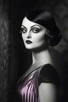 Op dit zwart-wit portret uit 1925 staat een elegante vrouw in art-decostijl tegen een muur in een donkere kamer. Ze draagt een stijlvolle avondjurk en lippenstift, wat haar tijdloze elegantie en vrouwelijkheid benadrukt. Zacht licht valt op haar figuur en creëert dramatische schaduwen die haar mysterieuze uitdrukking en gracieuze houding benadrukken. De onscherpe achtergrond trekt het oog specifiek naar de vrouw, wat het beeld een mysterieuze diepte geeft en een sfeer van subtiele verfijning en nostalgische schoonheid.