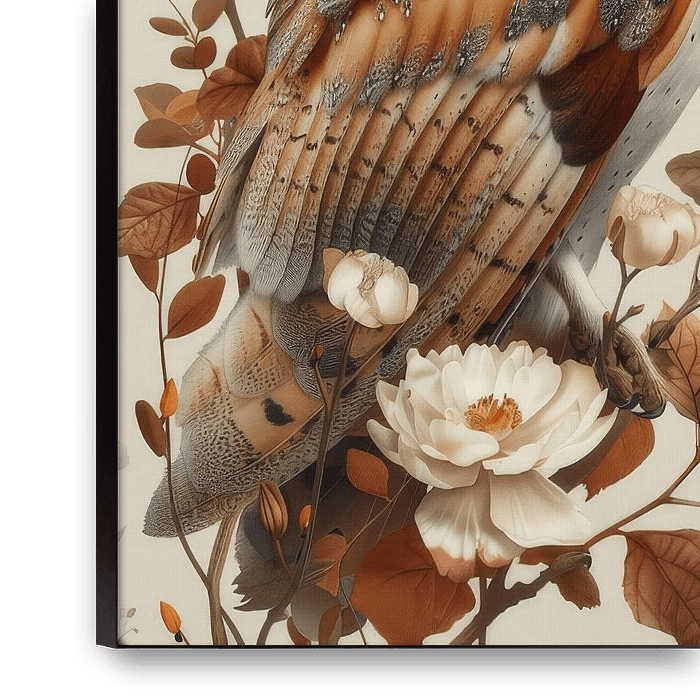 "Elegantie in de Schemering" toont een prachtige kerkuil, omgeven door subtiele bloemmotieven in warme tinten van bruin en crème. De uil, met zijn sierlijke en gedetailleerde veren, straalt een rustgevende gratie uit die perfect in harmonie is met de delicate bloemen rondom hem. De zachte kleuren en het uitgebalanceerde ontwerp…