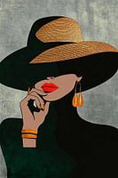 Een vleugje glamour en mystiek ontvouwt zich door het elegante silhouet van een stijlvolle dame met een indrukwekkende hoed. Haar felrode lippen trekken ieders aandacht, terwijl de gouden accenten in de sieraden fonkelen. Dit sfeervolle kunstwerk geeft een speciaal tintje aan elke woon- of slaapkamer en nodigt uit tot dromerige ontspanning.