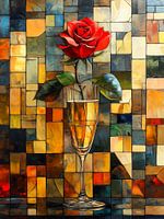 De tijd lijkt stil te staan, gevangen in één magisch moment. Een prachtige rode roos in volle bloei - het toppunt van schoonheid en gratie. Deze roos, symbool van liefde en passie, staat delicaat en krachtig tegelijk in een slank, elegant champagneglas. De gouden vloeistof in het glas vangt het licht en laat het schitteren op een betoverende manier, alsof het moment zelf een feestelijke gelegenheid is.