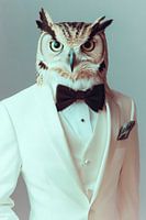 Een fascinerend samenspel van elegantie en natuur ontvouwt zich hier: Een stijlvol geklede heer in een smetteloos wit dinerjasje, met de majestueuze kop van een uil die uit zijn kraag gluurt. De grote, oplettende ogen en de fijne veren van het gevederde wezen geven deze mix van dier en mens een unieke, bijna surrealistische flair.