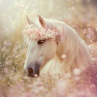 De majestueuze figuur van een witte eenhoorn verschijnt in zacht licht, omringd door een zee van bloeiende bloemen. Een delicate bloemenkrans siert zijn hoofd en geeft hem een bijna sprookjesachtige uitstraling. De uitdrukking in zijn ogen straalt rust en gratie uit, terwijl de omgeving oplicht in zachte pastelkleuren en een vredige sfeer creëert.