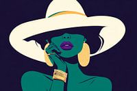 Elegantie ontmoet expressiviteit: een mysterieus silhouet met een verleidelijk samenspel van felgroen en diep paars. De brede hoed en gouden accessoires geven het beeld een vleugje glamour. Perfect voor in de woonkamer om een vleugje stijl en zelfvertrouwen toe te voegen. Een echte blikvanger die gesprekken stimuleert!