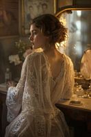 De foto legt een elegant moment vast waarop een jonge vrouw in een delicate witte kamerjas aan de kaptafel zit. Haar zachte blik is bedachtzaam en getuigt van gratie. Het delicate kant van de kamerjas en het zachte licht dat de kamer overspoelt, benadrukken de intieme, nostalgische sfeer van de setting.