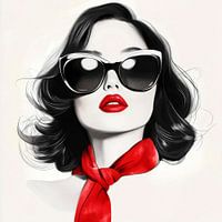 De foto toont een stijlvolle vrouw met een glamoureuze uitstraling. Haar oversized zonnebril draagt bij aan de mysterieuze charme, terwijl de felrode lipkleur en felrode sjaal sterk contrasteren met haar elegante, golvende haar. Deze combinatie straalt zelfvertrouwen en verfijning uit en verovert meteen de kijker.