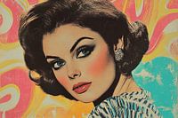 De achtergrond van het schilderij is een levendig pop-artstuk in de stijl van Andy Warhol, dat speelt met felle kleuren en dynamische vormen. Deze contrasterende achtergrond benadrukt de klassieke schoonheid van de vrouw en creëert een spannende link tussen traditie en moderniteit. De combinatie van de elegante figuur op de voorgrond en de kleurrijke, moderne achtergrond creëert een visueel spektakel dat zowel nostalgisch als eigentijds is. Het schilderij straalt een unieke energie uit en nodigt de kijker uit om zich onder te dompelen in een wereld waar elegantie en artistieke durf elkaar ontmoeten.