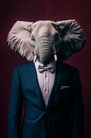 In een onverwacht samenspel van elegantie en onconventionaliteit staat een stijlvolle figuur in pak, wiens hoofd is vervangen door het majestueuze hoofd van een olifant. Het grote, grijze masker met zijn enorme oren en kenmerkende slagtanden geeft het scenario een surrealistische component die het gewone overstijgt en tot nadenken stemt.