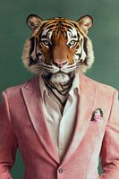 In een onverwacht samenspel van elegantie en wreedheid wordt een majestueuze tijger gecombineerd met de verfijndheid van een kostuumdrager. Het delicate roze pak contrasteert indrukwekkend met het krachtige, gestreepte hoofd, terwijl de zelfverzekerde houding en de fijne aanpak van de stropdas een vleugje excentriciteit aan het tafereel toevoegen. Een meesterwerk van surrealiteit!