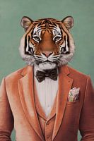 Een fascinerend wezen combineert de wildheid van de jungle met de charme van elegantie: een stijlvolle man met een majestueuze tijgerkop. In zijn fluwelen pak en klassieke stropdas straalt hij zowel verfijning als ongetemde kracht uit. De contrasterende combinatie van antropomorfe gratie en dierlijke wreedheid spreekt onmiddellijk tot de verbeelding.