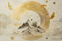 Deze unieke kunstwerk, met een combinatie van oosterse esthetiek en moderne lijnen, toont een eenzame ruiter die hoog boven de wolken staat, op een pad naar een verre horizon. De gouden lijnen voegen een verfijnde uitstraling toe, en de zachte tinten roepen het gevoel op van een inkttekening op rijstpapier. Een waar kunststuk voor liefhebbers van ingetogen, maar betekenisvolle decoratie, perfect om een rustige en verfijnde sfeer te creëren in elk interieur.