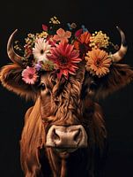 Deze afbeelding, die met behulp van AI is gegenereerd, toont een prachtig portret van een Schotse Hooglander, waarbij zijn gewei versierd is met bloemen. De bloemen, in zachte tinten roze en wit, lijken subtiel geschilderd en smelten samen met de natuurlijke uitstraling van het gewei. De achtergrond is egaal en bruin, wat de focus volledig op de hooglander en de bloemen legt. Het geheel straalt een elegante en serene sfeer uit, met een perfect balans tussen realisme en artistieke interpretatie.