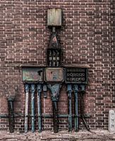 Oude elektriciteitskabels en elektriciteitskasten, bij een oude verlaten fabriek in Nederland.