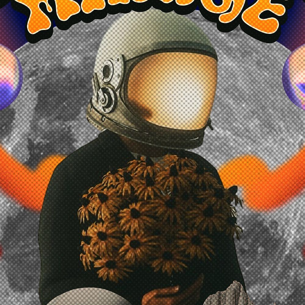 Een psychedelisch kunstwerk dat retro en kosmische elementen mengt, met een persoon in een ruimtepak die een boeket bloemen vasthoudt, omringd door planeten, sterren en kleurrijke surrealistische patronen. Het werk roept gevoelens op van zowel de natuur als de kosmos, en symboliseert het snijpunt van menselijk leven en het universum.