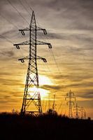Een prachtige zonsondergang creëert silhouetten van de hoogspanningsmasten. Gefotografeerd tijdens een fietstochtje buiten de stad, ik moest gewoon stoppen en de camera tevoorschijn halen. Normaal probeer ik hoogspanningskabels uit mijn foto's te verwijderen, omdat ik vind dat ze afleiden, maar deze keer zijn ze de focus naast het prachtige gouden uur zonlicht, de verspreide wolken en de dramatische kleurrijke lucht.