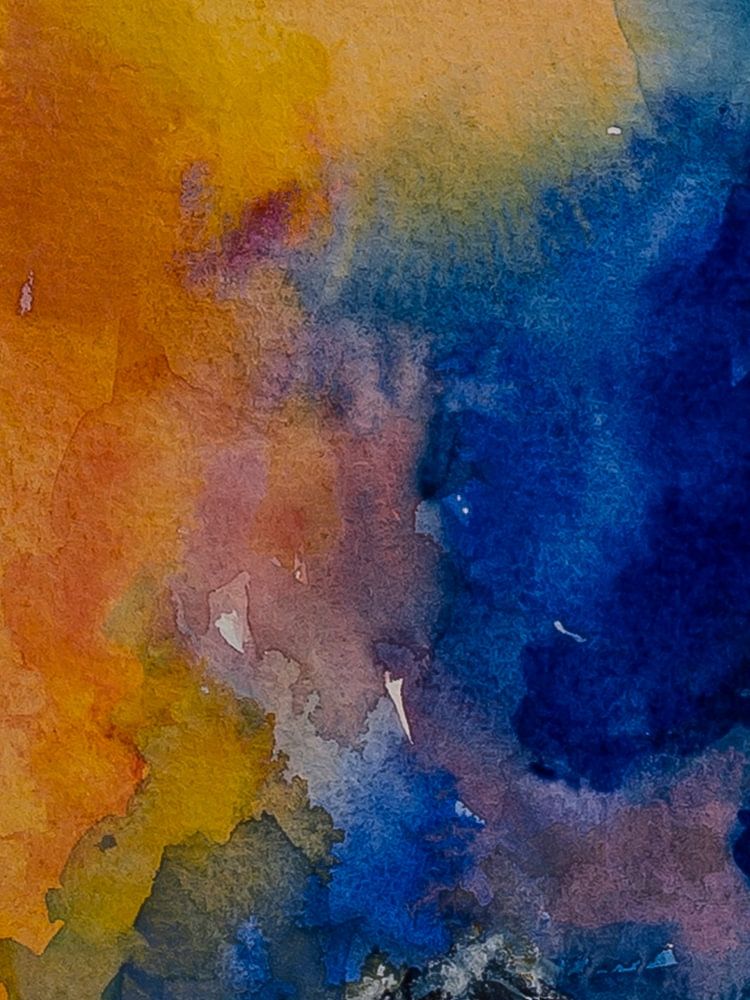 Een explosieve aquarel waarin de elementen op elkaar botsen. Links laait een intens warm oranjegeel op als vuur aan de hemel, terwijl rechts diepblauw en indigo zich als dreigende wolkenmassa's samenpakken. Onderaan kolkt donker, woest water — krachtig en ontembaar.