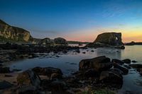 Op een olifant gelijkende rots in het water in de buurt van Ballintoy Harbour, aan de Antrim kust in Noord-Ierland. Lokaal bekend als Elephant Rock. 's Avonds laat gefotografeerd bij maanlicht.