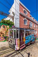 Met graffiti versierde kabelbaan Elevador da Glória op weg van de wijk Baixa naar de wijk Bairro Alto in Lissabon, Portugal