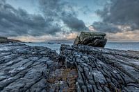 Donkere wolken afgewisseld met blauwe luchten bij het rotsen strand van Elgol Beach op het eiland Skye in Schotland. De dramatische wolkenluchten zijn vooral te zien in november.