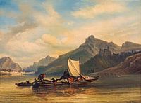 landschap met de rivier de Rijn tussen de bergen onder een wolkenlucht.