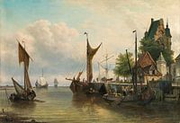 zeilboten liggen in de haven bij een stad. Mensen en een paard met wagen staan op de kade met op de achtergrond wolken.