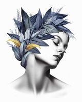 Een illustratie in zwart/wit, gecombineerd met vintage, botanische afbeeldingen in de kleur blauw met een klein beetje goud.