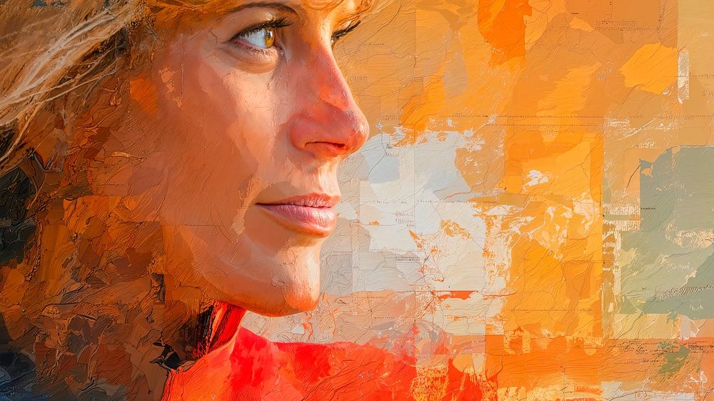 Een vrouw met kort haar staart peinzend in de verte. Haar ogen worden omgeven door een artistieke overlay van vintage texturen en patronen in aardse tinten, wat een mixed-media-effect creëert. De achtergrond is voorzien van gelaagde elementen, die diepte en complexiteit toevoegen aan haar serene uitdrukking.