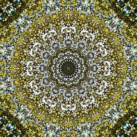 Een cirkelvorming, mandala-achtig beeld in geel, blauw en wit, gebaseerd op een foto van de blaadjes van een olm tegen een blauwe hemel in de lente.