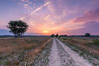 Eltspeetse Heide (Gelderland, Nederland) is gefotografeerd tijdens de zonsondergang. Links naderde een regenbui, maar de zon kreeg nog ruimte om mooi onder te gaan.