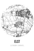 Zwart-witte landkaart, stratenplan of plattegrond van Elst. Elst is gelegen in de Betuwe, in de gemeente Overbetuwe, provincie Gelderland. Op de stadskaart zijn alle openbare wegen in Elst opgenomen. Verder is de kaart voorzien van de coördinaten van het centrum van Elst.