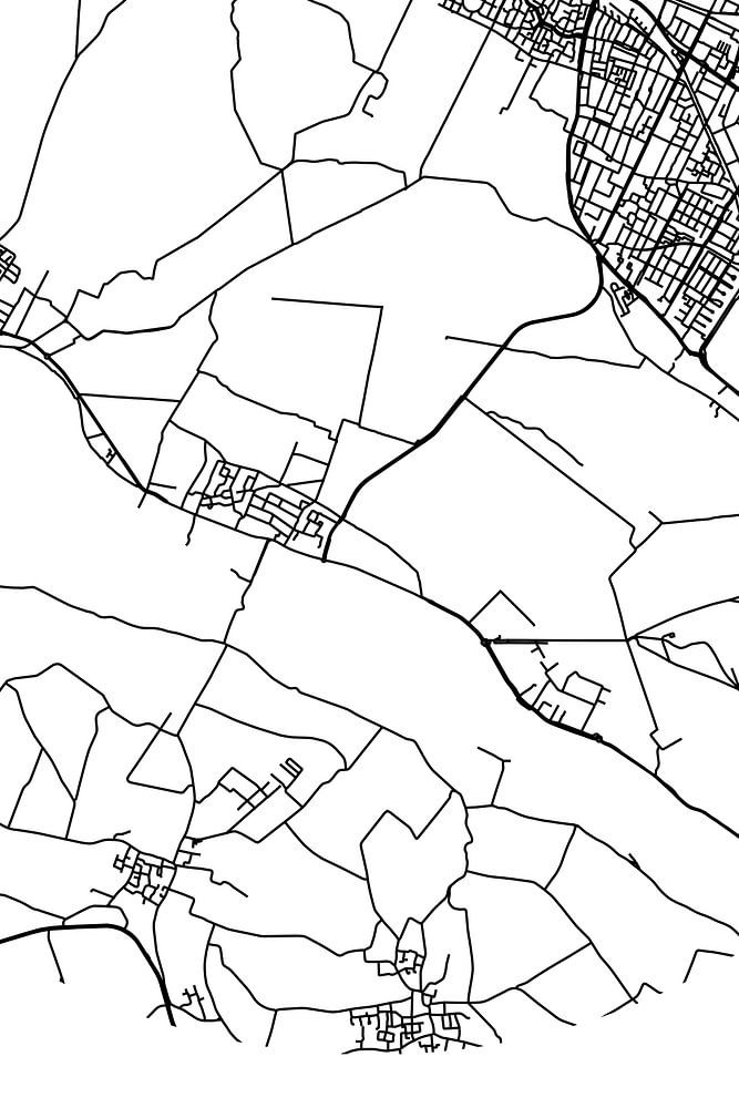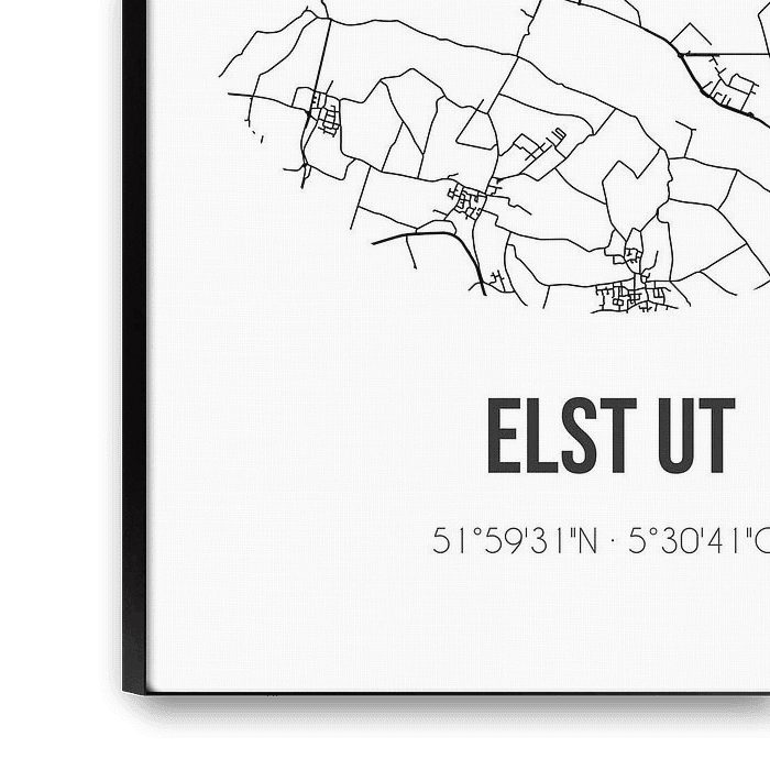Zwart-witte landkaart, stratenplan of plattegrond van Elst Ut. Elst Ut is gelegen in de gemeente Rhenen, provincie Utrecht. Op de stadskaart zijn alle openbare wegen in Elst Ut opgenomen. Verder is de kaart voorzien van de coördinaten van het centrum van Elst Ut.