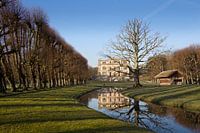 Het grote landhuis van het landgoed Elswout op de grens van Haarlem en Overveen. In het stille water worden zowel het huis als de markante, iconische boom mooi gereflecteerd.