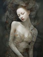 Portret van een serene vrouw met gesloten ogen, ze wordt omringd door abstracte, wervelende patronen die opgaan in haar doorschijnende, etherische huid. Zachte, gedempte kleuren en delicate details creëren een dromerige sfeer.