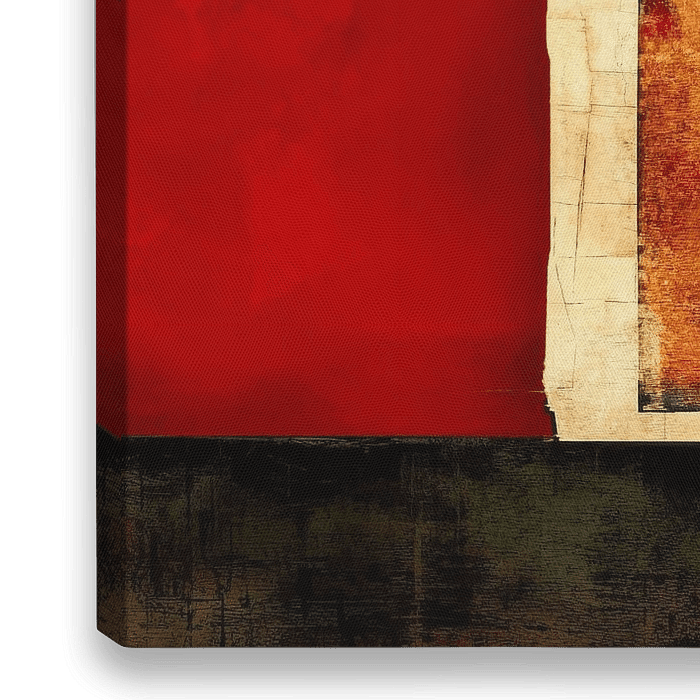 Ember Blocks - Dit abstract schilderij toont een compositie van geometrische vormen en rechthoekige blokken, dominant gekleurd in aardetinten van oranje en rood, gecomplementeerd door neutralen als beige en grijs, wat een rustgevende maar krachtige visuele ervaring oplevert.
