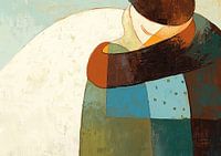 Embrace Hues - Dit abstracte schilderij toont de gestileerde vorm van een omarmend paar, omhuld in een patchwork van rijke, aardse kleuren met een vleugje blauw en oranje, wat een warm en intiem tafereel creëert.