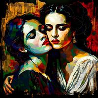 Portret van een innige omhelzing. Vol liefde en genegenheid. Een kleurrijk, impressionistische afbeelding, waarbij gebruik is gemaakt van pallet mes technieken. Het geheel straalt liefde en warmte uit. Zowel door de emotie in de gezichten als het kleurgebruik. Liefde begint bij houden van jezelf en zelfacceptatie.