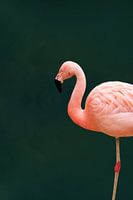 Deze print is een echte eye-catcher! De achtergrond is smaragdgroen met watercolor effect. De echte ster is echter de roze flamingo die het beeld in "wandelt".