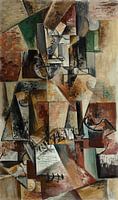 Een persoon, een mens leest een tekst in dit kubistische schilderij.
