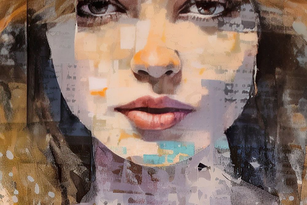 Emily Portret - abstract schilderij / mixed media kunst geschilderd. Mooi contrast tussen het verfijnde portret en rauwe collage/schildertechniek.