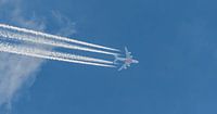 Emirates A380 trekt condensstrepen hoog in de lucht.
