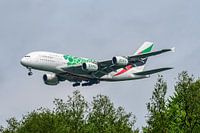 Een Airbus A380 van Emirates, voorzien van de groene Expo 2020 livery, gaat even later landen op de Buitenveldertbaan.