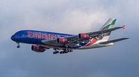 Deze Airbus A380 van Emirates is voorzien van de NBA livery.