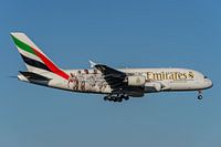 Deze Airbus A380 van Emirates, met registratie A6-EOA, is voorzien van Real Madrid livery.